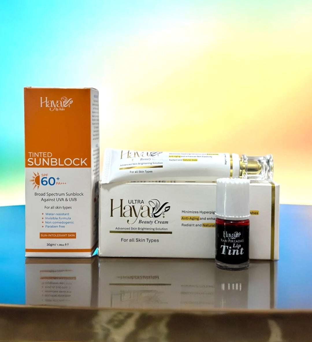 Eid Glam Essentials Set (Haya Beauty Cream Ultra + Tinted Sunblock + Organic Lip Tint)